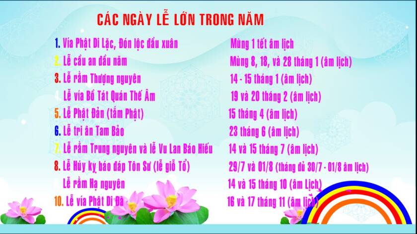 Phật giáo là một tôn giáo với lịch sử lâu đời và nhiều truyền thống phong phú. Trong suốt năm, Phật tử tổ chức nhiều ngày lễ và sự kiện quan trọng để tôn vinh và nhớ về cuộc đời và giáo lý của Đức Phật.…